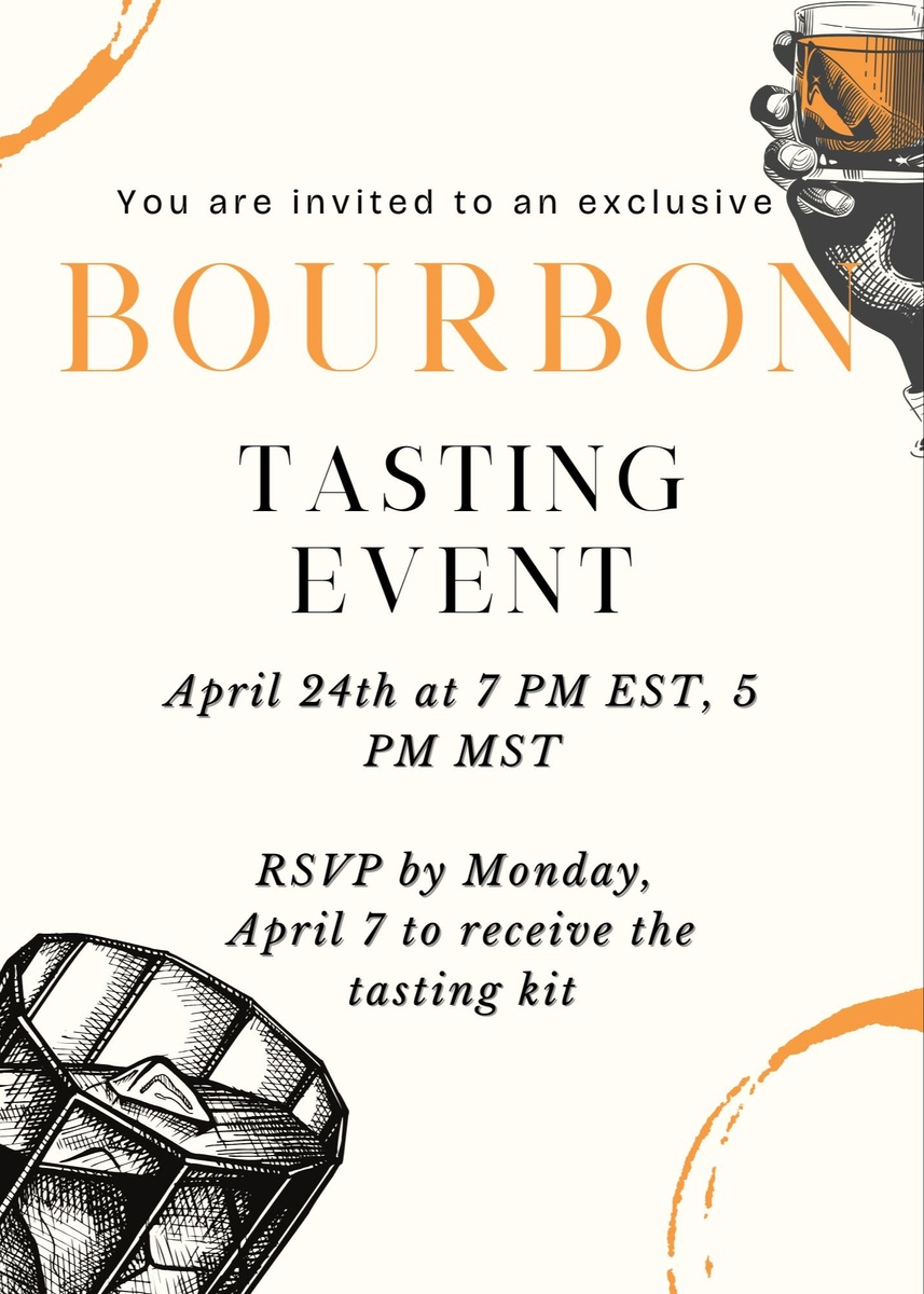 Your family has been hand-selected to join us for a virtual bourbon-tasting event on Thursday, April 24th at 5 PM MST, 7 PM EST.